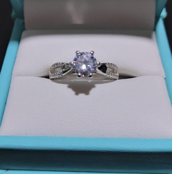 • Banda Entrelazada con Micro-pavé: Los hombros del anillo presentan un diseño cruzado único, adornado con pequeñas incrustaciones que añaden un resplandor adicional a cada lado de la piedra principal.